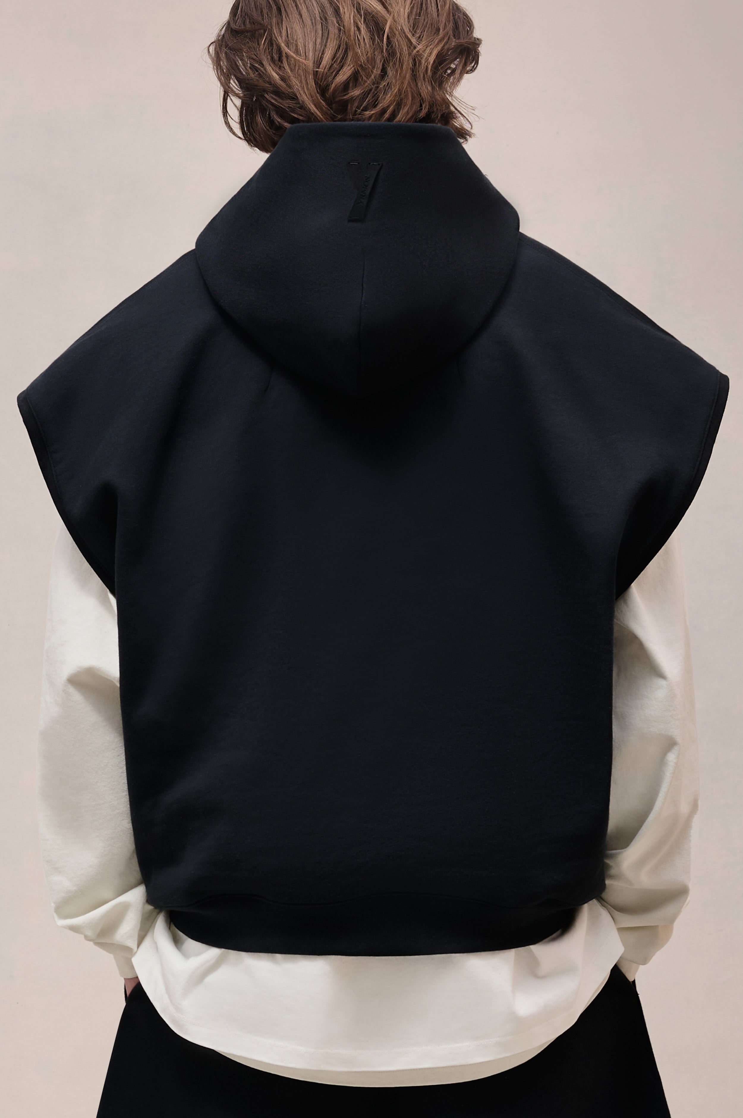 Sleeveless hooded sweater in heavyweight organic cotton fleece, brushed for a soft inner feel.